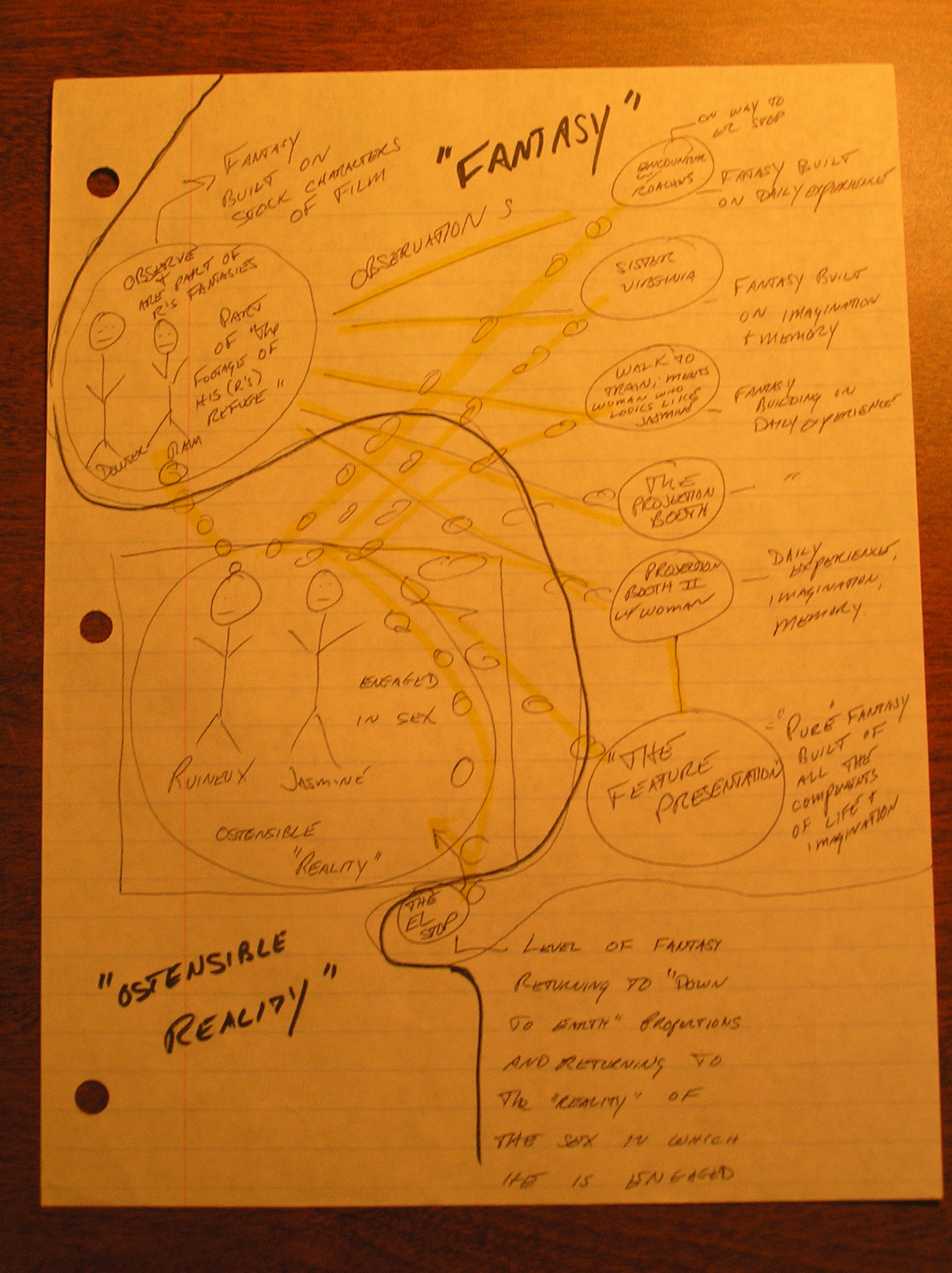 Before I knew what a mind map was, I was mind mapping. Using scrap paper and pen I worked out some of the more difficult lines of association comprising the worm hole structure of my novel Flicker in the Porthole Glass. The following artifact shows a mind mapping exercise I completed sometime in 1993 over a couple afternoon hours–and several pints–in the cozy dark atmosphere of Zeno’s on Allen Street, State College, PA. (You can see a more detailed view here).